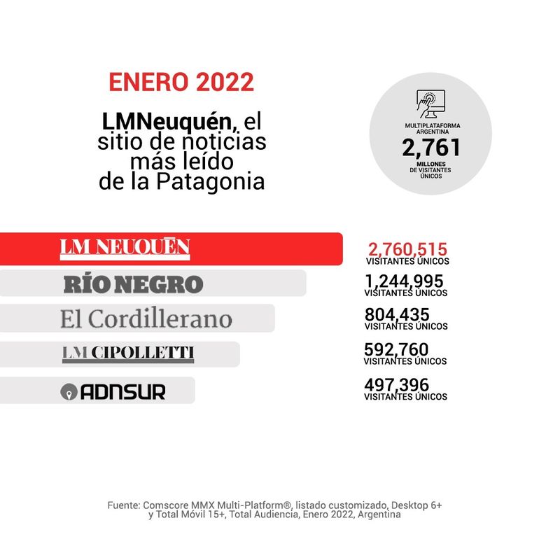 LMNeuquén se afianza como el sitio de noticias más leído de la Patagonia y se mantiene como líder del sector en la región encabezando el ranking durante todo 2021 y el primer mes de 2022.