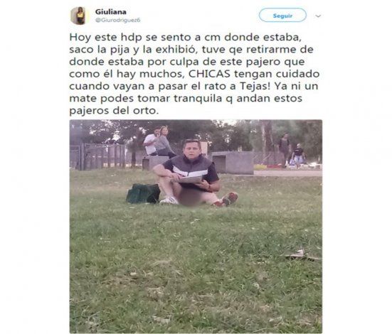 "Hoy este hdp se sentó a centímetros donde estaba, sacó la pija y la exhibió. Tuve que retirarme de donde estaba por culpa de este pajero, que como él hay muchos", twitteó Giuliana Rodríguez en su cuenta.