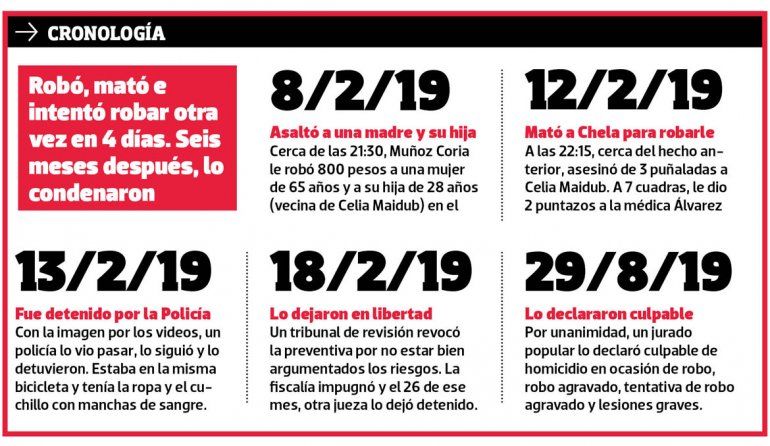 Ella sobrevivió de milagro, como también sus primeras dos víctimas, una madre y su hija, vecinas lindantes de Chela, a quienes el acusado interceptó en la calle y les robó 800 pesos. “Se salvaron porque no opusieron resistencia”, había expresado el fiscal jefe Santiago Terán sobre estas víctimas, a quienes Muñoz Coria les robó la noche del 8 de febrero.
