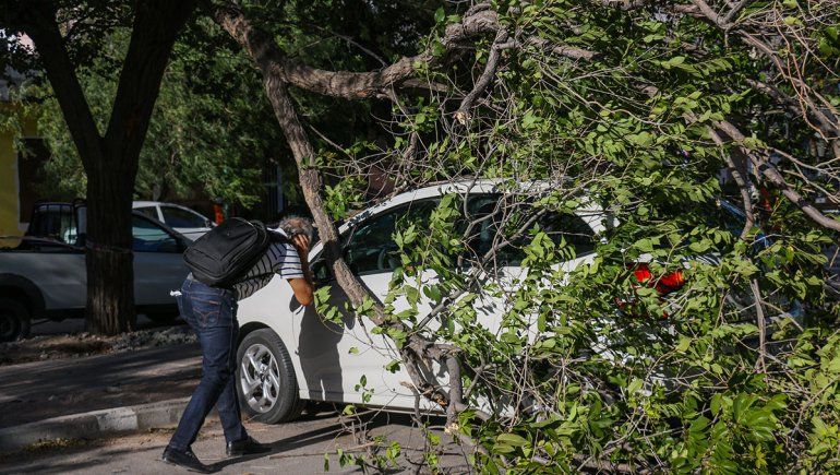 Una rama de un árbol se desprendió y cayó sobre la parte trasera de un automóvil Renault Fluence en el centro de Neuquén.