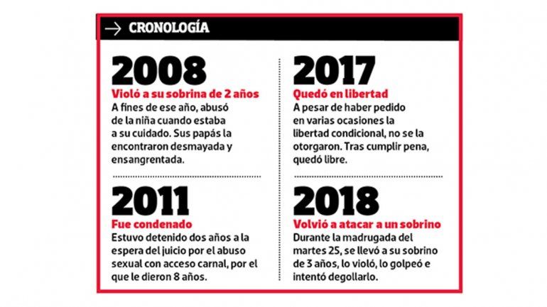 El acusado ya había cumplido una condena de 8 años por violar en 2008 a otra sobrina cuando tenía 2 años (ver aparte). En diciembre de 2017 recuperó la libertad y estuvo alquilando un departamento con un subsidio que recibía del Gobierno por una supuesta discapacidad que tiene.