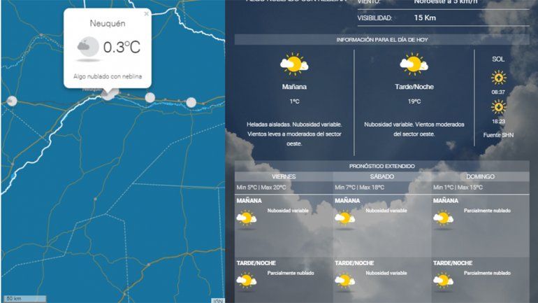 Para el sábado, el día estará con algunas nubes por la tardes y parcialmente nublado por la noche, con máximas que rondarán los 18° y mínimas de 2°, mientras que el domingo el cielo se presentará mayormente cubierto por la tarde e inestable por la noche. Además, se esperan temperaturas máximas de 15°.