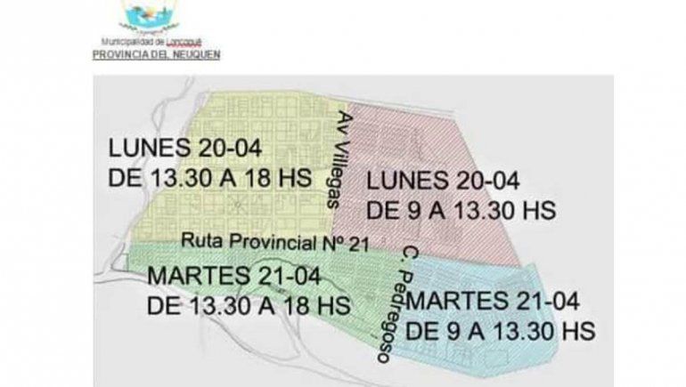 Para ello se dividió al pueblo en cuatro partes que podrán salir de compras el lunes 20 entre las 9:30 a las 13, el sector entre la avenida Conrado Villegas y la ruta provincial 21 hacia el norte. Mientras que el sector sur de este mismo tramo, lo podrá hacer el lunes por la tarde de 13:30 a 18. El martes por la mañana le tocará a los vecinos de calle Cerro Pedregoso hacia el noreste y por la tarde a quienes viven hacia el sector sureste de la calle, ruta 21 y la junta Loncopué Agrio.