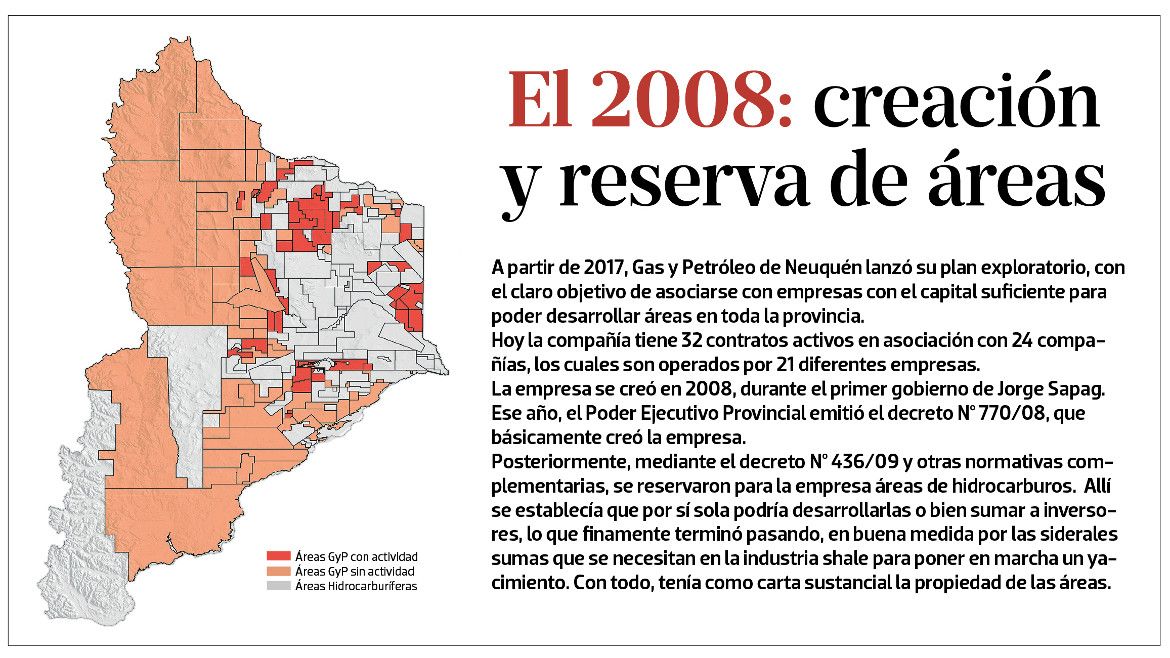 GyP tiene reservadas por un decreto provincial unas 104 áreas, de las cuales 34 están en actividad. En parte de ellas, la empresa provincial es socia de algunas de las petroleras más grandes del mundo.