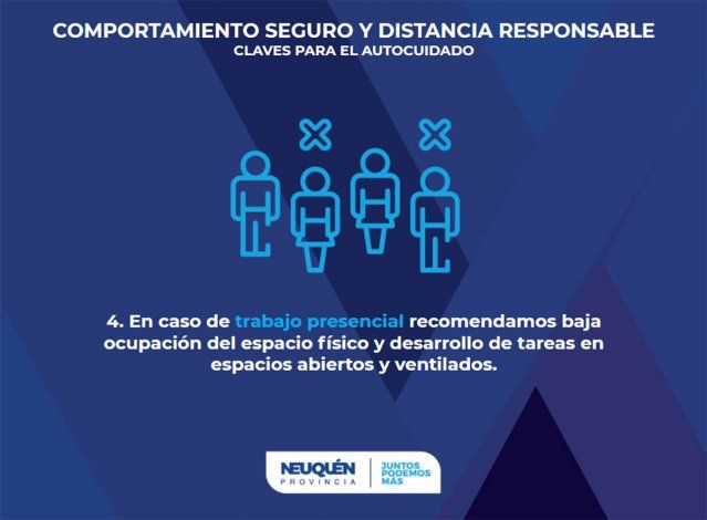 La cuarta política anunciada por el gobernador fue el pedido de que en caso de tener que asistir a los lugares de trabajo se respete la baja ocupación y se aprovechen los espacios abiertos o ventilados.