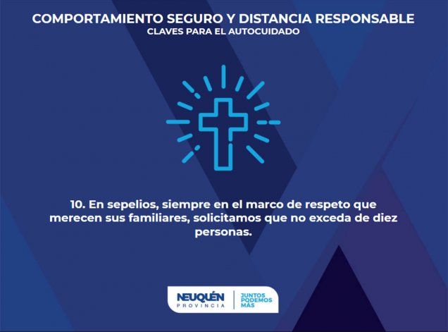Por último, como décima se recordó la importancia de limitar la asistencia a los sepelios a sólo 10 personas. Sosteniendo el respeto hacia el duelo de las familias, se aconseja sostener los hábitos de distanciamiento para evitar contagios.