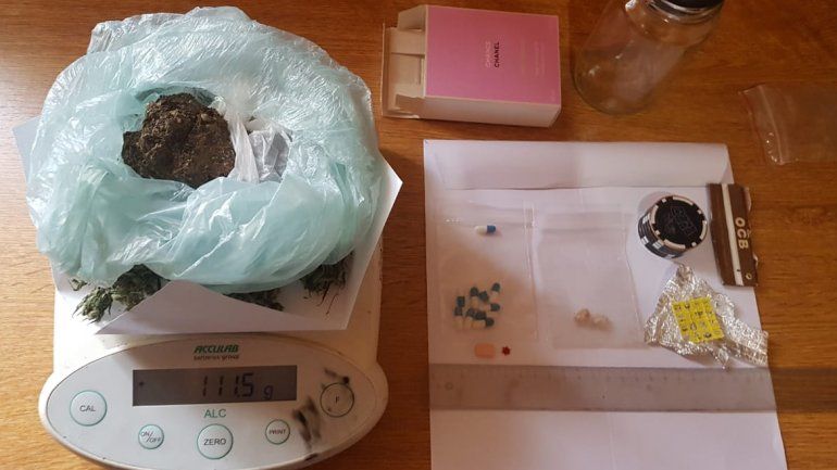 Al momento de revisar el vehículo, Gendarmería encontró 111,5 gramos (111,5grs) de una sustancia vegetal compacta de color verde- amarronada (que coincidiría con marihuana), veinticuatro troqueles de LSD, dos pastillas de éxtasis, y dos rocas presumiblemente de la llamada droga sintetica “cristal”.
