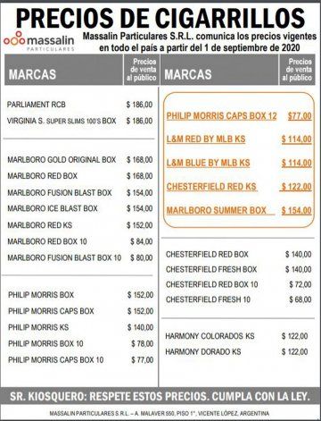 Por su parte, Massalin Particulares (la otra empresa productora más grande que opera en el país) también aplicó incrementó del 7% del valor de venta, pero lo hizo el martes pasado. Con la actualización de precios, cada paquete de 10 cigarrillos pasó a tener un precio mínimo de 77 pesos.
