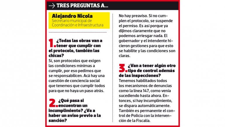 El secretario de Coordinación, Alejandro Nicola, contó que los constructores lo empezaron a llamar desde el domingo, apenas se conoció el decreto con el visto bueno de Provincia. “Hubo mucha demanda, con muchas consultas y no sólo el lunes, sino todo el fin de semana”, confió.