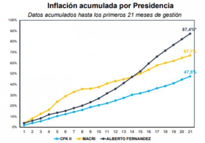 La inflación registrada en los primeros 21 meses de la presidencia de Alberto Fernández es la más alta de las últimas administraciones para el mismo período, con un 87,4% que supera los índices de precios al consumidor de Cristina Fernández de Kirchner y Mauricio Macri.