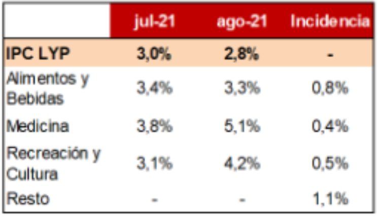 El índice oficial del mes pasado será difundido el próximo martes 14 de septiembre por el Instituto Nacional de Estadística y Censos (INDEC). LyP destacó que la inflación acumulada en los primeros ocho meses de 2021 llegó al 32,7% y ya superó la pauta del 29% con la que se elaboró la ley de Presupuesto, un desfase que se reflejó en la necesidad del Poder Ejecutivo de modificar el cálculo de gastos y recursos en diez oportunidades.