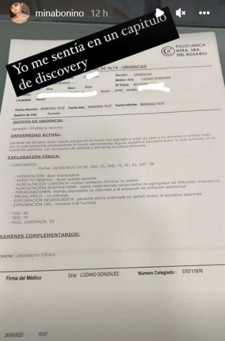 Mina Bonino indicó sobre los test: "Los análisis mostraban si tenía cocaína, marihuana, éxtasis, anfetaminas o antidepresivos en sangre. Todo muy sutil para que nos desvalijen la casa y no me entere, rey. Pasamos nuestro primer día en el hospital. Vomitada por mi amiga y robada por algún conocido que me vio dormir en pelotas y es lo que más me perturba".