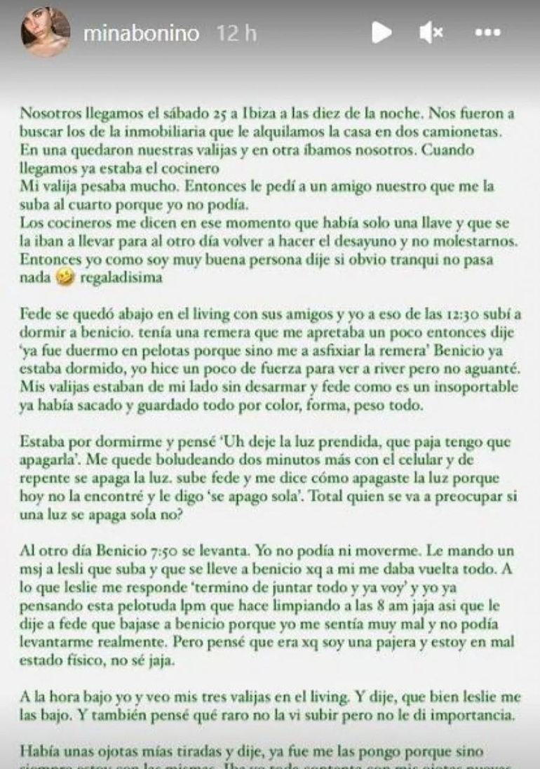 Lo que debían ser unas vacaciones de ensueño, terminaron en una pesadilla. La periodista argentina Mina Bonino, pareja del futbolista del Real Madrid Fede Valverde, publicó en su perfil de Instagram un extraño suceso que arruinó la estadía en Ibiza.