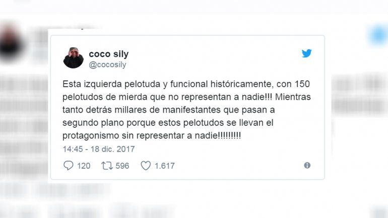Sily recalcó que los episodios ocurren por “esta izquierda pelotuda y funcional históricamente, con 150 pelotudos de mierda que no representan a nadie!!!"