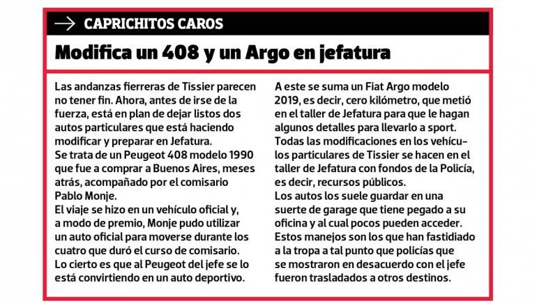 En noviembre de 2017 la jefatura recibió una serie de vehículos y Tissier ordenó reacondicionar una camioneta que luego utilizó para el mundial de rafting, en noviembre de 2018, pese a que la aseguradora no le había autorizado las modificaciones, por lo que circuló sin seguro.