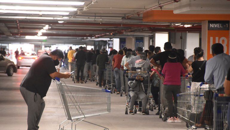 Muchas familias se separaban para comprar: mientras un integrante hacía la fila para comprar carne, la otra persona ingresaba al supermercado para elegir el resto de los alimentos y artículos de limpieza. Sin embargo, la espera era tan abrumadora que muchos optaron por levantar la tapa de sus changuitos para usarlos como asientos.