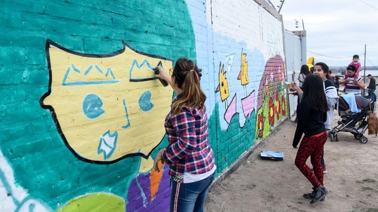 "El boceto trata sobre los Derechos del Niño y termina en como en una gran barda para representar el barrio", dijo Arias mientras daba los retoques finales a la obra colectiva."Yo soy de Islas Malvinas, esta es la primera vez que se hace, a este nivel tan zapado. Es una doble emoción porque estoy pintando en mi barrio y porque nunca había visto un evento así para los chicos", añadió.