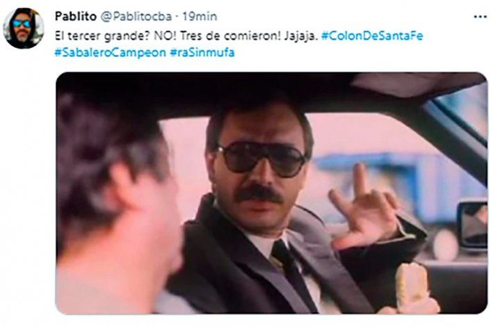 Festeja Colón, sufre Racing. El Sabalero consiguió el primer título de su historia en la máxima categoría del fútbol argentino y todo es alegría entre sus fanáticos, que apelaron a los tradicionales memes para celebrar esta conquista en la Copa de la Liga Profesional. Una vez sellada la goleada, las redes sociales se inundaron de burlas y comentarios divertidos relativos al logro del elenco dirigido por Eduardo Domínguez.