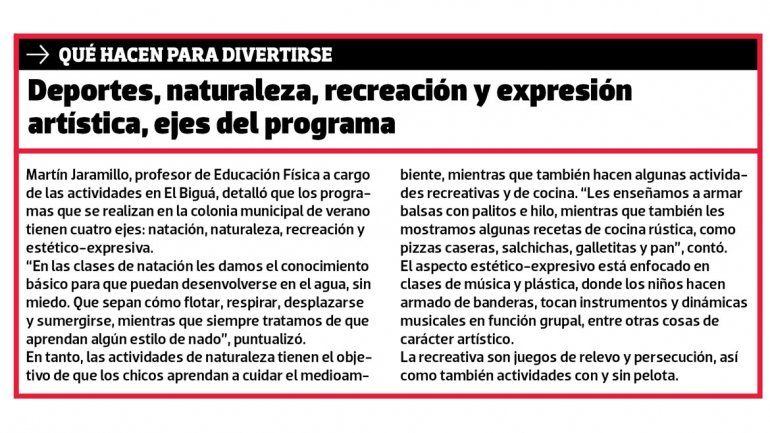 Martín Jaramillo, docente de Educación Física a cargo de las actividades en El Biguá, comentó a este medio que separan a los niños en grupos por edad para practicar las actividades previstas para cada mañana. De esta manera, le dan dinamismo a la colonia y mantienen a los chicos interesados y con ganas de volver.