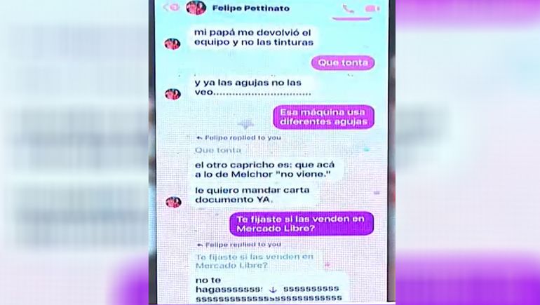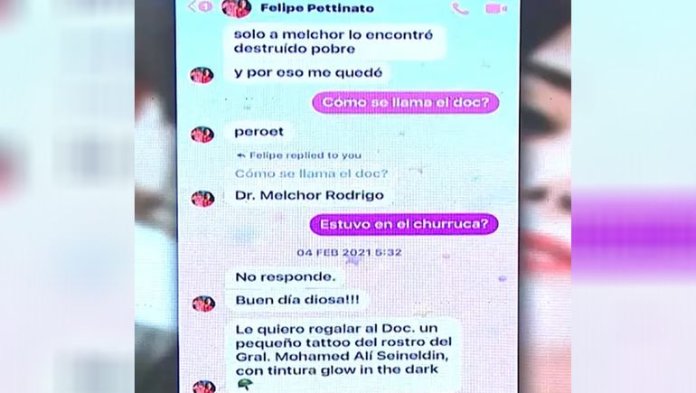 “Solo a Melchor lo encontré destruido, pobre. Y por eso me quedé”, habría escrito Felipe. En otra parte de la conversación, el hijo del conductor le dice a su interlocutora que le quiere regalar un tatuaje. “Quería hacerle un obsequio a Melchor”, se leía y luego agregaba. “Le quiero regalar al Doc. un pequeño tattoo del rostro del Gral. Mohamed Alí Seineldín, con tintura glow in the dark”.