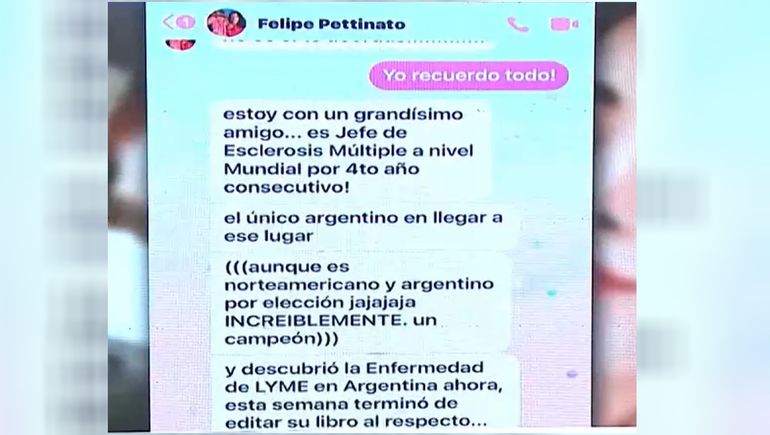 La primera de las conversaciones se habría llevado a cabo “hace seis o siete meses”, indicó el chimentero, para luego comentar el contenido de la charla. En el chat, Felipe presenta a su amigo y menciona su especialidad: “Estoy con un grandísimo amigo... ¡es jefe de esclerosis múltiple a nivel mundial por cuarto año consecutivo! El único argentino en llegar a ese lugar”, habría escrito Pettinato y luego continúa: “Aunque es norteamericano y argentino por elección jajajaja increíblemente. Un campeón… Descubrió la Enfermedad de Lyme en Argentina ahora, esta semana terminó de editar su libro al respecto”.