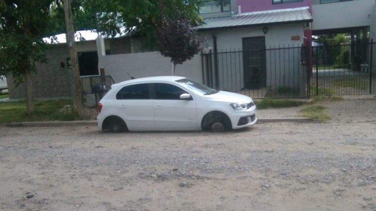 Otro de los hechos, cada vez más comunes en la ciudad, ocurrió en el barrio Rincón de Emilio. El dueño de un Gol color blanco, que estaba estacionado en la calle África, sufrió el robo de tres ruedas. Indignados, desde la vecinal compartieron la foto en su cuenta de Facebook y recomendaron "guardar los vehículos dentro de sus patios".