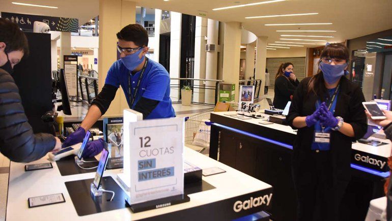 No hizo falta controlar el límite de una persona cada 16 metros cuadrados, porque ningún centro de compras superó los 30 o 40 visitantes a la vez. El momento de mayor circulación fue a la mañana, de 10:30 a 12, y el tránsito por los pasillos no se acercó siquiera a lo que era antes de la cuarentena. La gente iba al local que tenía como destino, compraba lo que hacía falta y se volvía a su casa. Casi no se vieron curiosos que deambularan sin rumbo fijo. En los shoppings que comparten el acceso con el supermercado, el movimiento fue mayor. Las tiendas se beneficiaron con los clientes que pasaban con el changuito y decidían llevar algo que veían en vidriera.