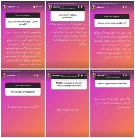 Luli Salazar es muy activa en sus redes sociales, las utiliza tanto para publicitar sus trabajos como para hablar y mostrar parte de su vida privada, en la que la estrella principal es su hija Martilda. En un contacto con sus casi dos millones de seguidores, la modelo se prestó a responder preguntas en sus stories de Instagram.