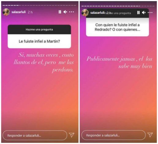 Pero la sorpresa llegó cuando un seguidor le preguntó a la escultural rubia si le había sido infiel a Redrado, a lo que, sin pelos en la lengua respondió, “sí, muchas veces. Costó llantos de él, pero me las perdonó”. Luego Luli dijo que jamás diría el nombre de los hombres con los que le fue infiel, pero que “Redrado los sabe muy bien”.