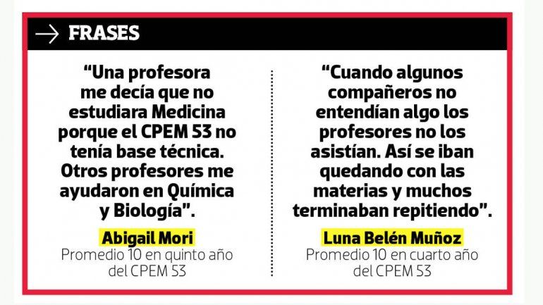 El CPEM 53 tiene algunos notables contrastes en cuanto al rendimiento de los alumnos que allí concurren. Por un lado, fue la escuela de donde egresaron Luna y Abigail, con promedios de 10 en cuarto y quinto año, respectivamente. Pero, por otro, muestra una realidad que se repite en muchos establecimientos de la provincia de Neuquén: la enorme cantidad de alumnos que comienzan los estudios secundarios y nunca terminan.