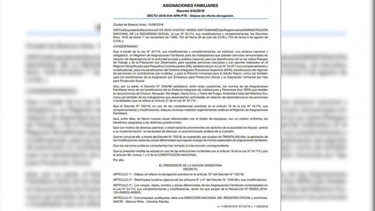 A través de un decreto (816/2018) publicado hoy en el Boletín Oficial, el jefe de Estado dejó sin efecto la derogación que había dispuesto de esos beneficios.