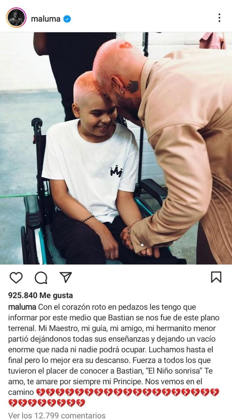 En las últimas horas y a través de sus redes sociales, Maluma compartió la noticia del fallecimiento de Bastián Matías Madrid Ramírez, niño al que había apadrinado. El pequeño, que padecía de cáncer, se había convertido en parte de la familia de Juan Luis, nombre de pila del músico, tanto así que se refería a él como su hermanito menor.