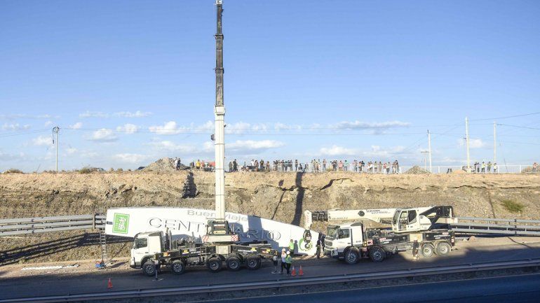 "Ayer estuvimos hasta las 20 pero desgraciadamente por el viento no lo pudimos colocar. Es un cartel que tiene 60 metros de largo por 20 de ancho. Por ahora y hasta el mediodía tenemos habilitado un solo carril en dirección Neuquén-Centenario pero al mediodía el corte será total", explicó en diálogo con LU5, el comisario Ricardo Arias, de la Dirección de Tránsito Neuquén de la Policía.