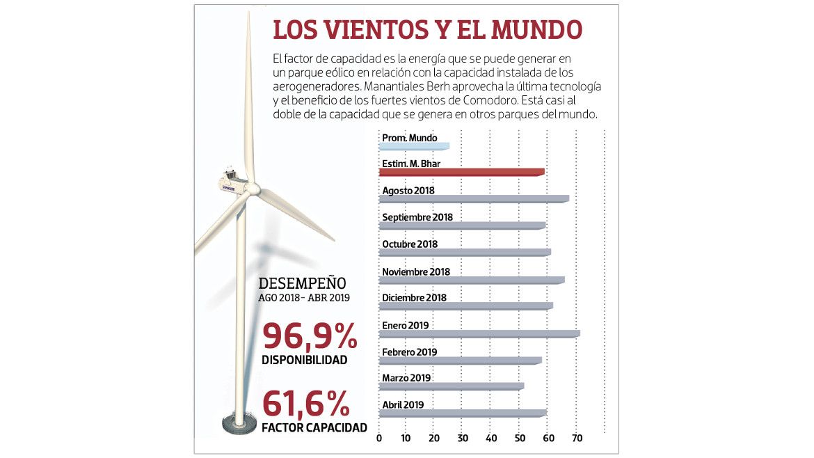 Manantiales Berh no solo es el parque eólico más grande, sino también el más eficiente. Tiene una generación de electricidad de casi el 60% de los 99 MW de la potencia instalada, lo que lo ubica entre los mejores del mundo. Ni siquiera la media mundial del factor de capacidad supera el 30%, debido a que en países como Dinamarca, Noruega o Alemania, la carrera de la energía eólica empezó hace más de 30 años y con viejos parques que aún necesitan un recambio tecnológico. La tendencia del mercado de parques, sobre todo en los de mar adentro, son con aerogeneradores cada vez más grandes.
