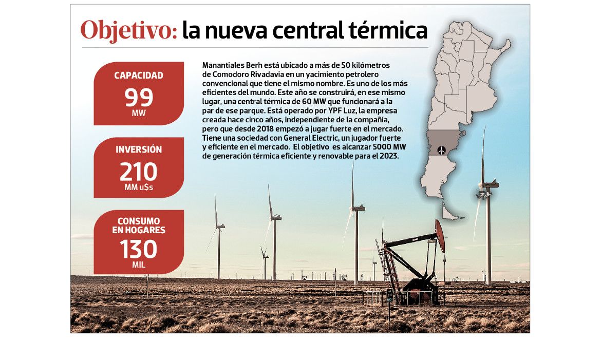 La empresa administradora tiene en operación 1819 MW en todo el país, de los cuales 99 son de Manantiales Berh y el resto, de circuitos combinados y energía térmica. Hoy YPF Luz está abocada a la construcción de una central térmica de otros 58 MW dentro de Manantiales Berh, para combinar la energía de los vientos y la del gas. Será con el mismo gas que se saca del yacimiento y la energía que producen los vientos en todo el año.