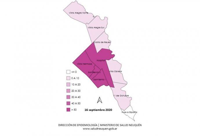 La dirección de Epidemiología también toma como referencia la zona de Vista Alegre como el área de influencia en ese análisis del 16 de septiembre y concluye, y muestra un rango de 0 a 40 casos en el sector de Costa de Reyes (barrio rural desde la calle 9 en la Ruta 7 como referencia hasta la costa del río Neuquén), Vista Alegre Sur (calle 10) y Vista Alegre Norte (calle 15 y límite con la provincia de Río Negro).