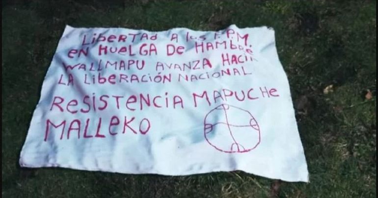 Como suele ocurrir en estos casos, los atacantes dejaron un cartel en el lugar y allí aseguran: “Libertad a los P.P.M. (presos políticos mapuches) en huelga de hambre, Wallmapu avanza hacia la liberación nacional, Resistencia Mapuche Malleko”.