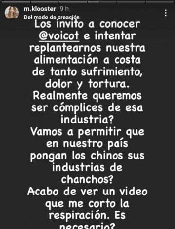 “Los invito a conocer @voicot e intentar replantearnos nuestra alimentación a costa de tanto sufrimiento, dolor y tortura ¿Realmente queremos ser cómplices de esa industria?", expresó Marcela Kloosterboer en una storie de Instagram.