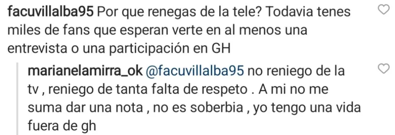 Estos comentarios despertaron las consultas de la gente que se mostraron intrigados sobre los motivos por los que no había estado entre los integrantes del debate. “¿Por qué renegás de la tele? Todavía tenés miles de fans que esperan verte en al menos una entrevista o una participación en ‘GH’”, le marcaron en Instagram.