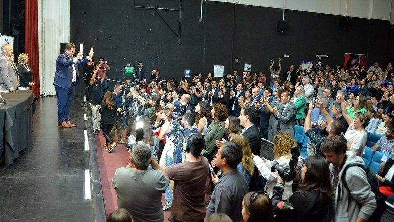 Luego de que los presentes entonaran los himnos nacional y provincial, Mariano Gaido subió al escenario para recibir el documento que lo reconoce como el legítimo ganador de las elecciones a intendente. Fue ovacionado por unos 300 simpatizantes del partido y se mostró muy contento.