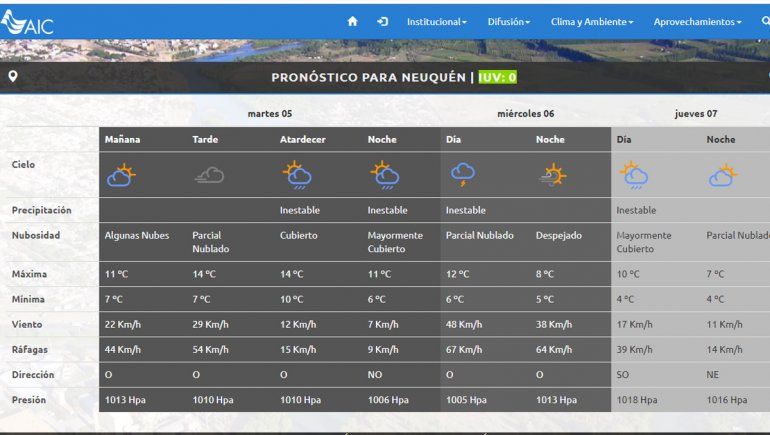 Según la AIC, el ingreso de un sistema frontal provocará lluvias y nevadas persistentes en la región cordillerana de Neuquén y Río Negro, condiciones que mantendrán en los próximos días. Pronosticó que la mayor intensidad se espera sobre zona andina y lagos de Neuquén. En tanto que, en región sur, valles y meseta se prevén períodos de viento e inestabilidad.