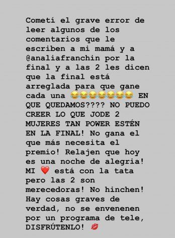 La hija de Claudia Villafañe redobló la apuesta y continuó: "¿En qué quedamos? ¡No puedo creer lo que jode dos mujeres tan power estén en la final (de MasterChef Celebrity)! ¡No gana el que más necesita el premio! Relajen que hoy es una noche de alegría! Mi corazón está con la Tata, pero las dos son merecedoras. ¡No hinchen! Hay cosas graves de verdad, no se envenenen por un programa de tele, disfrútenlo!".