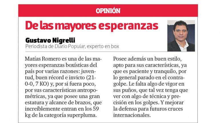 Romero, de 22 años acusó en la balanza 58,900 kg y de esta manera extendió a 21 su sorprendente récord de victorias, sin conocer aún la derrota. Es más, siete de esos triunfos fueron por nocaut. El periodista de Diario Popular de Buenos Aires, Gustavo Nigrelli, especializado en este deporte calificó a Romero como “una de las mayores esperanzas boxísticas” (ver aparte).