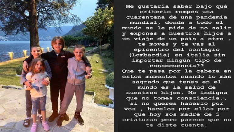 “Me gustaría saber bajo qué criterio rompés una cuarentena de una pandemia mundial, donde a todo el mundo se le pide no salir, y exponés a nuestros hijos a un viaje de un país a otro, te movés y te vas al epicentro del contagio (Lombardía) en Italia, sin importante ningún tipo de consecuencia”, escribió el futbolista en una historia de Instagram.