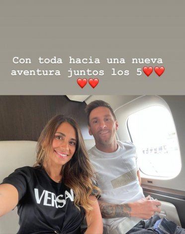 Ya en el avión que en instantes aterrizará en la capital francesa, Antonela Rocuzzo, esposa y madre de los tres hijos de la Pulga, compartió un tierno mensaje en su historia de Instagram que llena de esperanza a todos los seguidores de Messi: "Con todo hacia una nueva aventura juntos los 5".