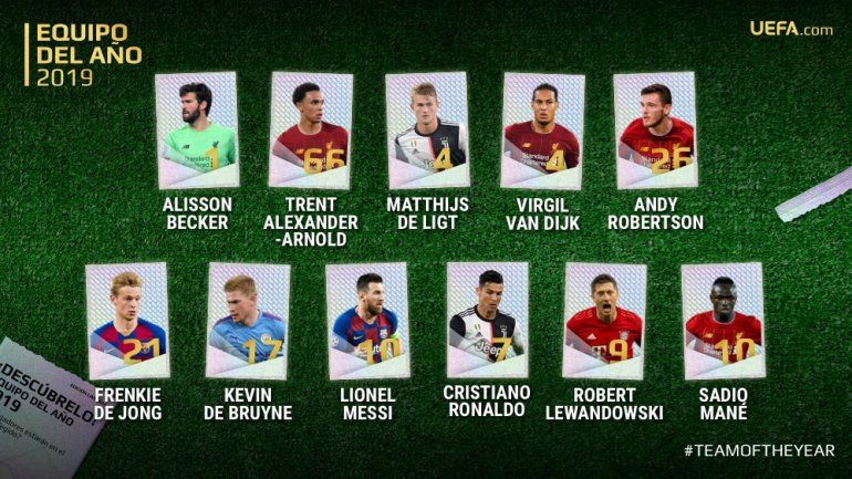 La formación ideal de la UEFA es la siguiente: Alisson Becker (Liverpool de Inglaterra); Trent Alexander-Arnold (Liverpool de Inglaterra), Matthijs de Ligt (Juventus de Italia), Virgil van Dijk (Liverpool de Inglaterra) y Andrew Robertson (Liverpool de Inglaterra).