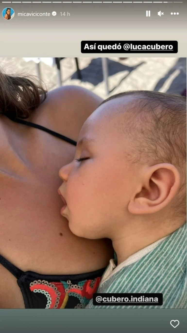 En el retrato se la ve a Indiana haciéndole upa a Luca, quien dormía tranquilo con un enterito verde, ambos protegidos del sol bajo una sombra. Y como detalle, además de arrobar a las cuentas del bebé y de la niña, comentó “cuidadora”. Y luego, subió otra postal de un primer plano del bebé mostrando como dormía.