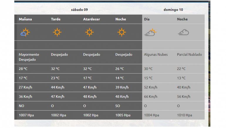 El viento estará presente durante todo el día con ráfagas que alcanzaran los 66 Km/h durante el día proveniente del oeste.