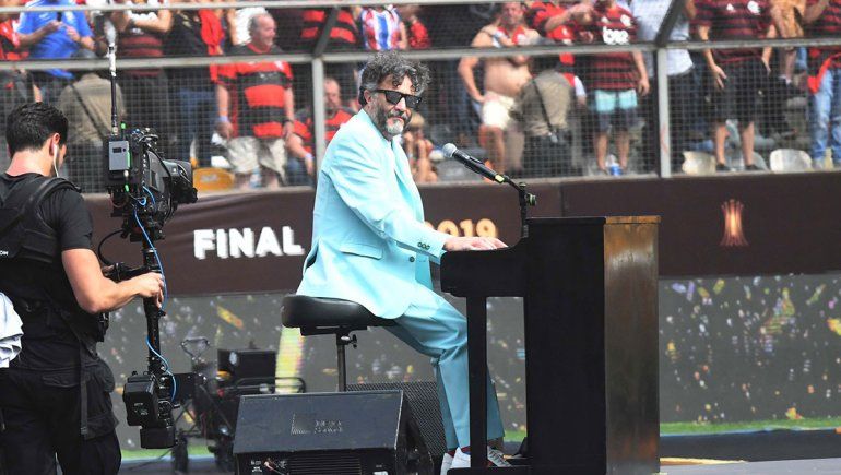 Páez, vestido con saco, pantalón y zapatos blancos, se sentó delante del piano negro para los acordes de "Dale Alegría A Mi Corazón", uno de sus himnos que fue coreado por la hinchada de River, especialmente.