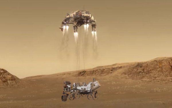 Reproducción artística del funcionamiento de la grúa que hizo descender a Perseverance a Marte (NASA).